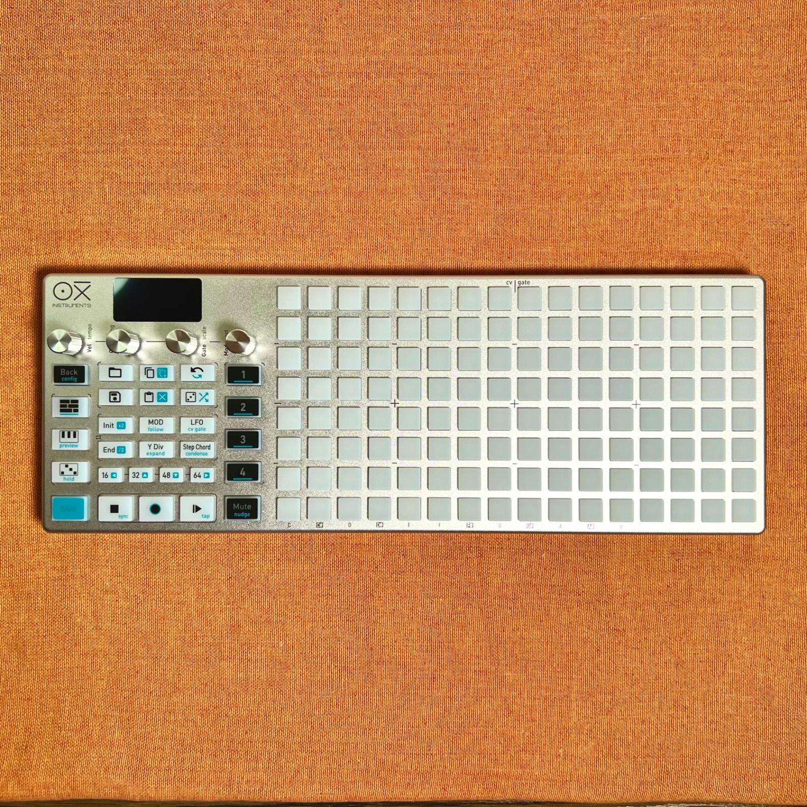 ですが、やろうと思えば、8つのGate出力/8つのCV出力、そしてMIDI出力という豊富な接続インターフェースを持ち合わせているため、これらをフルに使い、システムを構成する全ての機材をOXI ONEでコントロールするようなことも可能です。