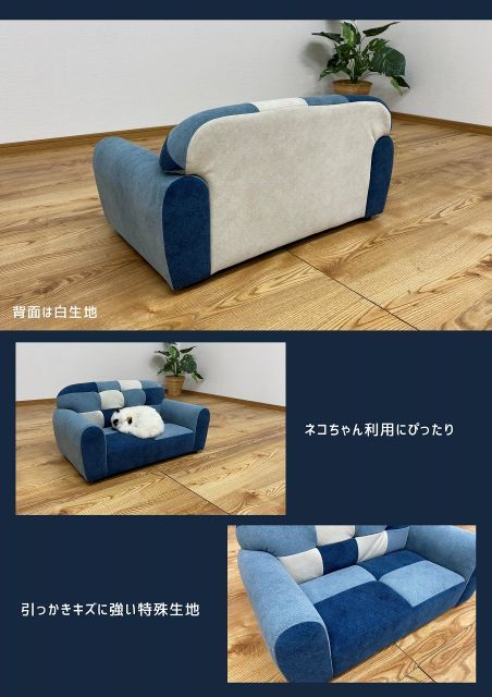 説明ブルー系を基調とした可愛いパッチワークソファ。ファブリック生地なのにキズが目立ちにくくブルー系パッチワークで可愛さアップ!