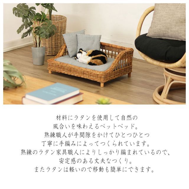 説明材料にラタンを使用して自然の風合いを味わえるペットベッド。熟練職人が手間隙をかけてひとつひとつ丁寧に手編みによってつくられています。熟練のラタン家具職人によりしっかり編まれているので、安定感のある丈夫なつくり。またラタンは軽いので移動も簡単にできます。