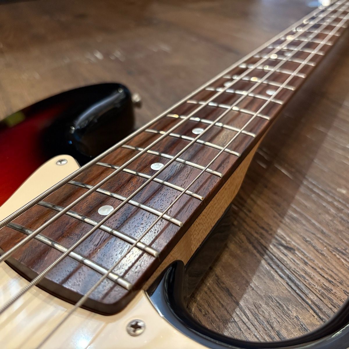 現在の弦高は4弦12Fで約3mm、1弦約2.8mmとスムーズな演奏が可能です。