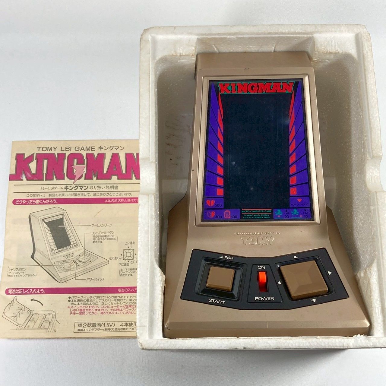 TOMY製「キングマン」のLSIゲームです。昭和レトロなデザインと電子音が懐かしさを感じさせるアイテムです。