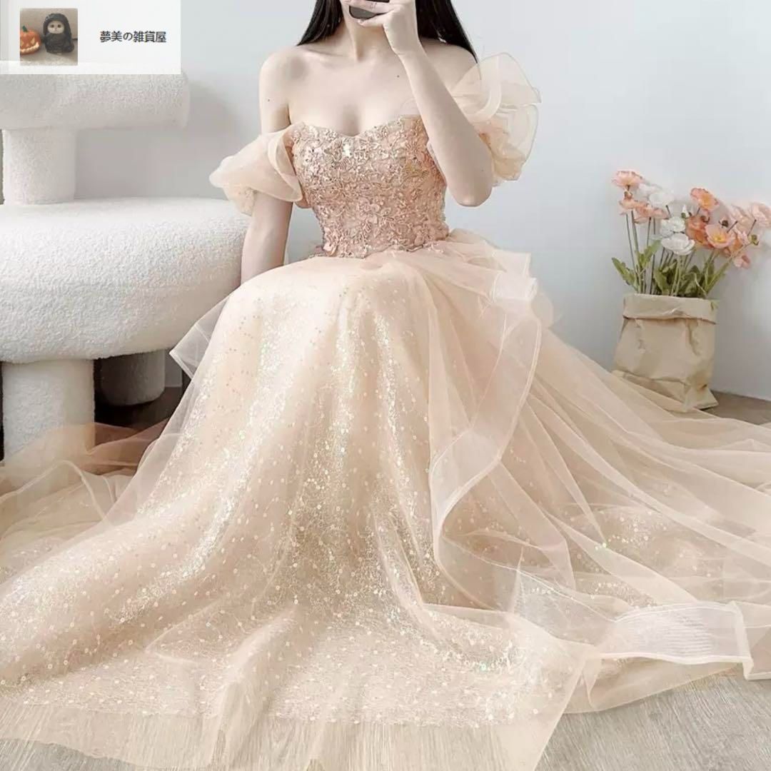 お花のデザインにスパンコールがオシャレでゴージャスな、オフショルダーのロングドレス??