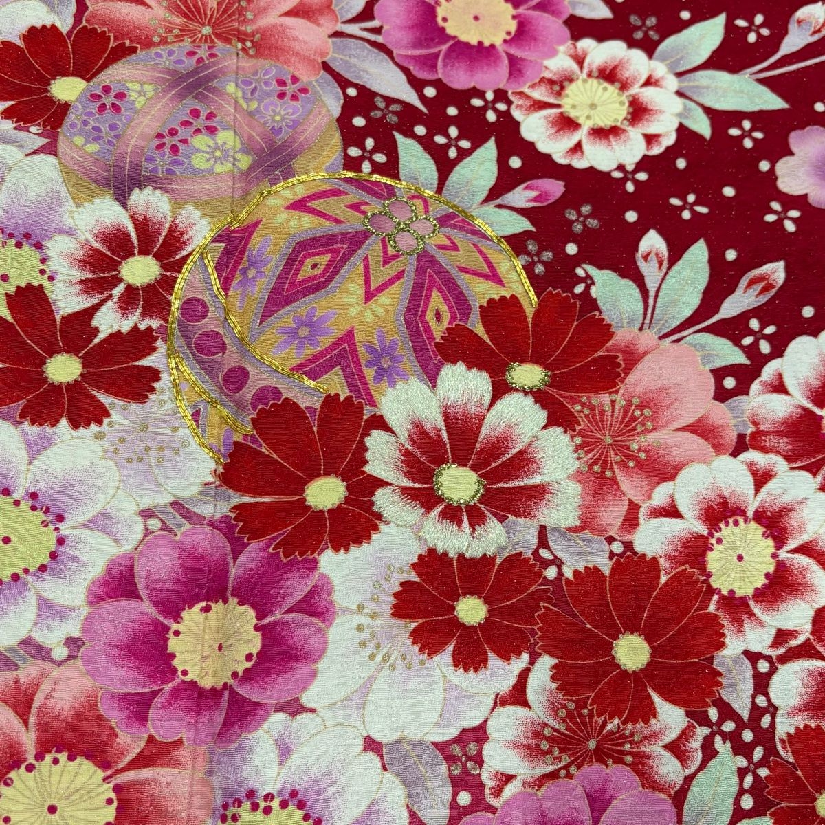 振袖 身丈167 cm 裄丈65 M 袷 手鞠 草花 金糸 銀通し 赤 正絹