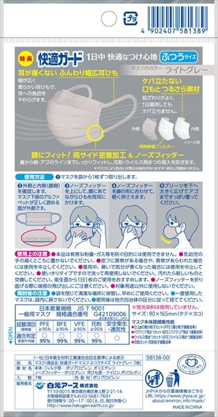 -120点セット 快適ガードマスク ふつうサイズ ライトグレー 入 白元アース マスク