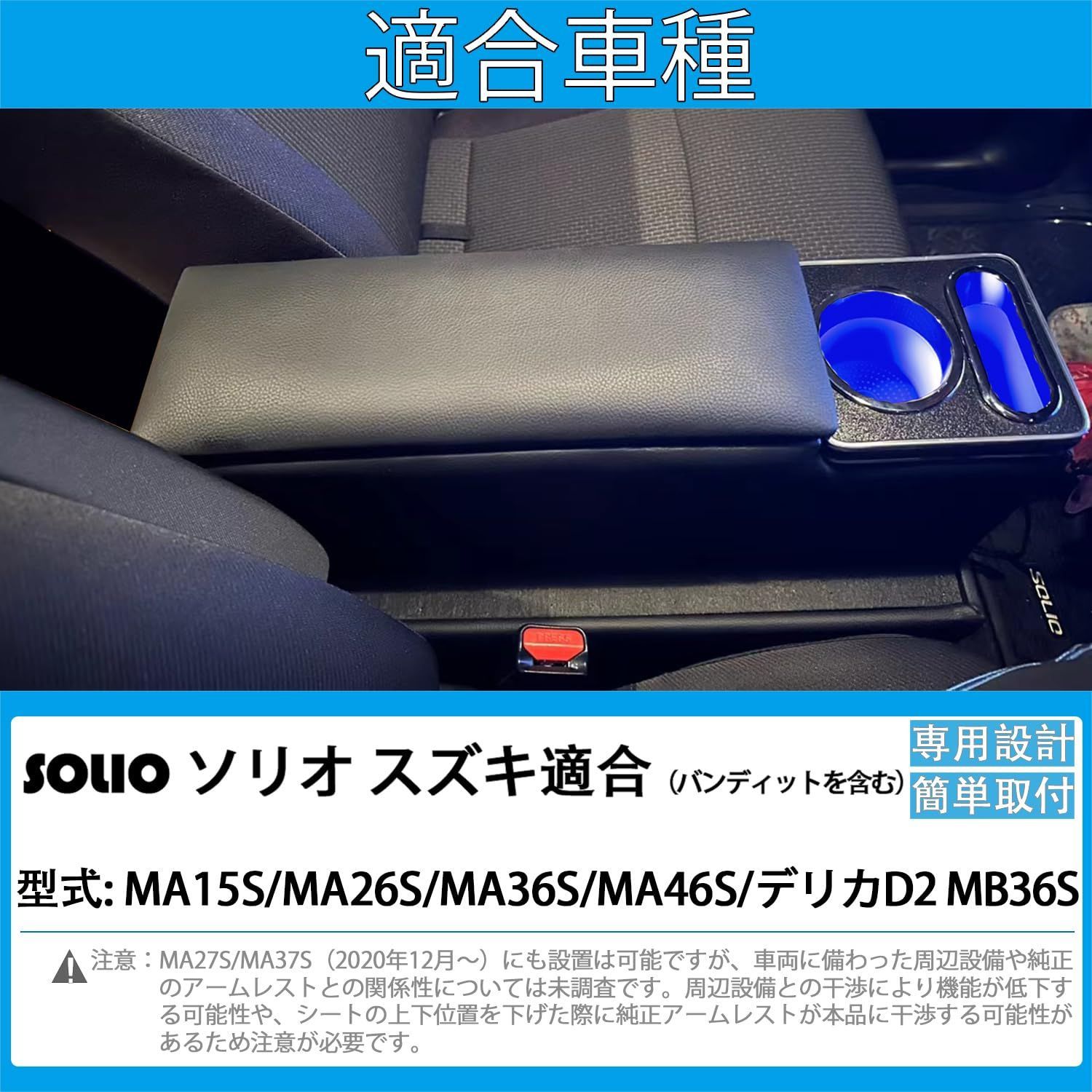 【適合車種】 ソリオに適合(バンディットを含む)。型式: MA15S/MA26S/MA36S/MA46S/デリカD2 MB36S※ 適合車種として案内している型式の車両でも、グレードやオプションの有無により、ご利用いただけない可能性があります。実車の設置スペースと本品の商品サイズを必ずご確認いただいた上で、お買い求めください。 ※ MA27S/MA37S(2020年12月~)にも設置は可能ですが、車両に備わった周辺設備や純正のアームレストとの関係性については未調査です。周辺設備との干渉により機能が低下する可能性や、シートの上下位置を下げた際に純正アームレストが本品に干渉する可能性があるため注意が必要です。