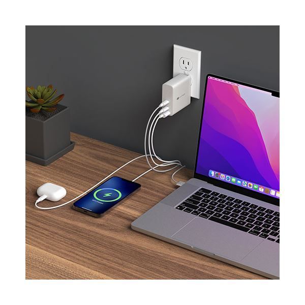 USB-Cポートを2つ、USB-Aポートを1つ搭載。MacBook、iPad、iPhoneなどの3つのデバイスを同時に充電できます。