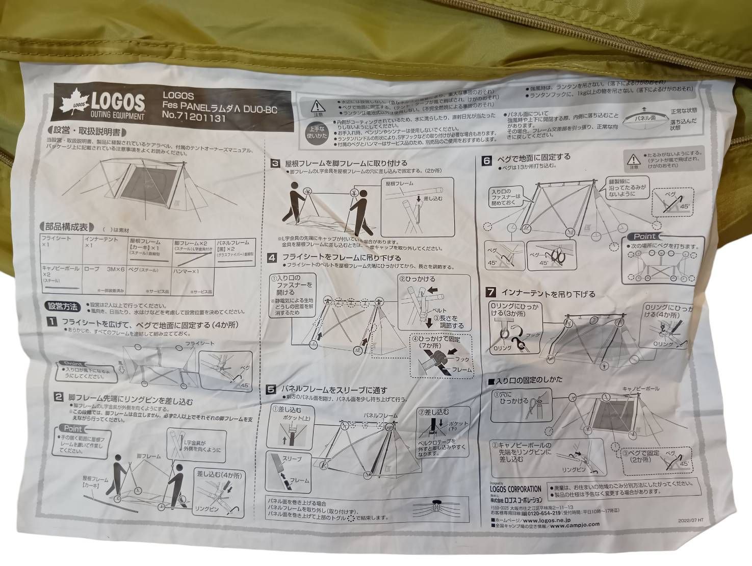 ■構成:フライシート、インナーテント 、屋根フレーム、脚フレーム×2、パネルフレーム×2、キャノピーポール×2、ロープ×6、収納バッグ、フレーム用収納袋、ペグ×19、ハンマー、小物袋