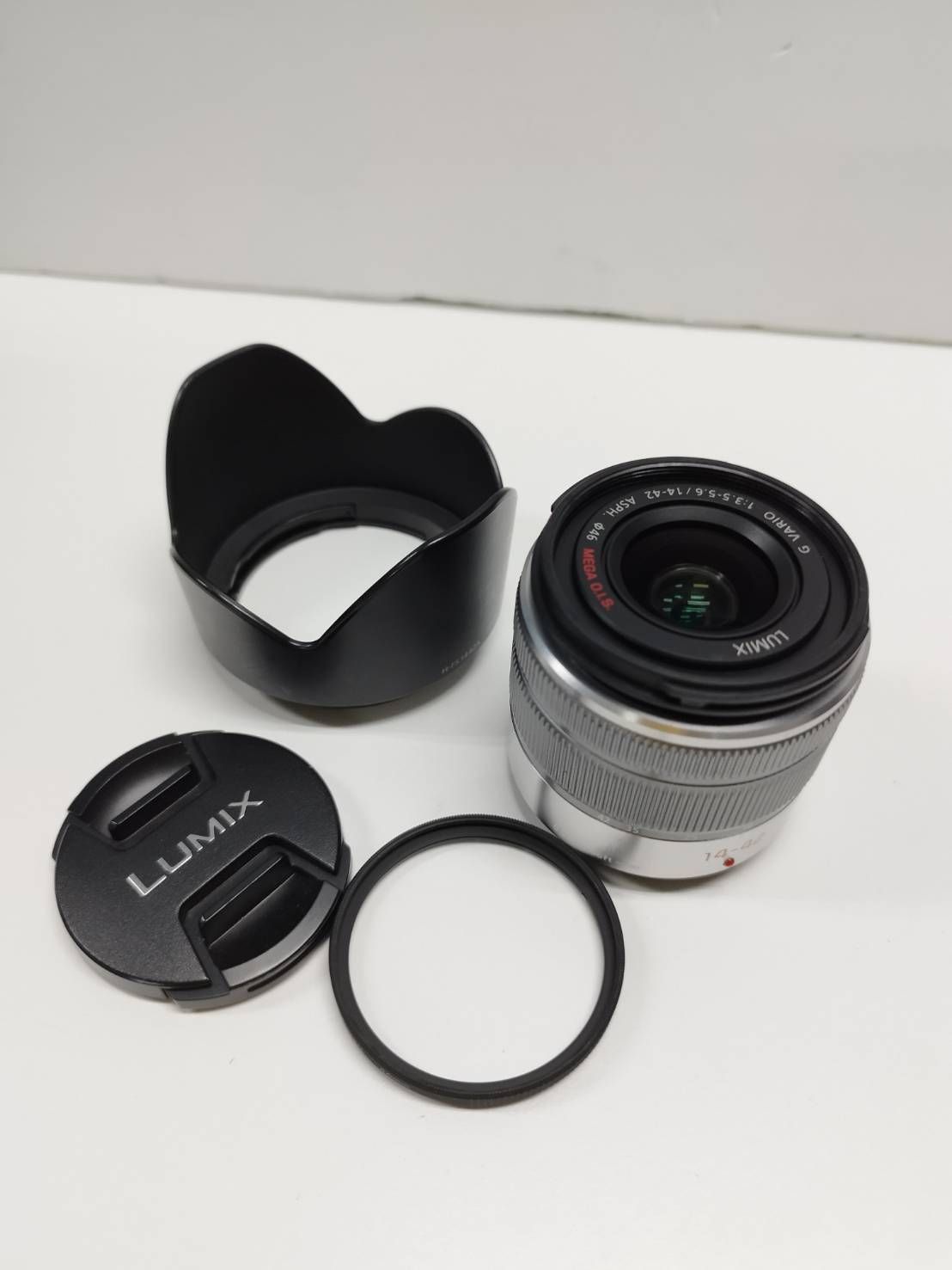 内容物:レンズ、フィルター、レンズフード、キャップ(画像1枚目に写っているもの)