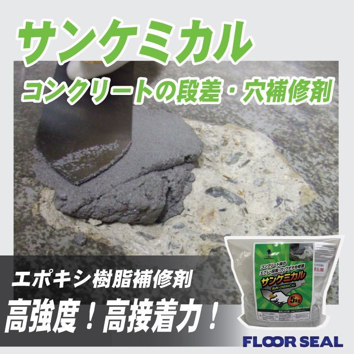 サンケミカルは、コンクリート床のエグレ、段差、ワダチ、穴などの補修に最適な二液性エポキシ樹脂です。モルタル補修に代わる画期的な製品で、コンクリートよりも高い強度と接着力を持ち、フォークリフトやプラッター・大型トラックの激しい通行にも耐えられます。施工は簡単で、どなたでも扱いやすいのが特徴です。