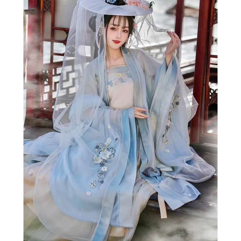 レディース 漢服 4点セット 宋朝 中国古代服装 振り袖羽織付き チャイナ服 ブルー系 大人 花刺繍 華やか 中華古典 宮廷風 貴妃 皇后 仮装
