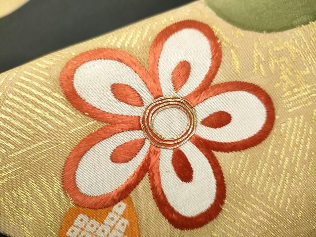 平和屋着物 アンティーク 大正ロマン 丸帯 引き抜き帯 駒刺繍 舞花文 金彩 正絹 hy