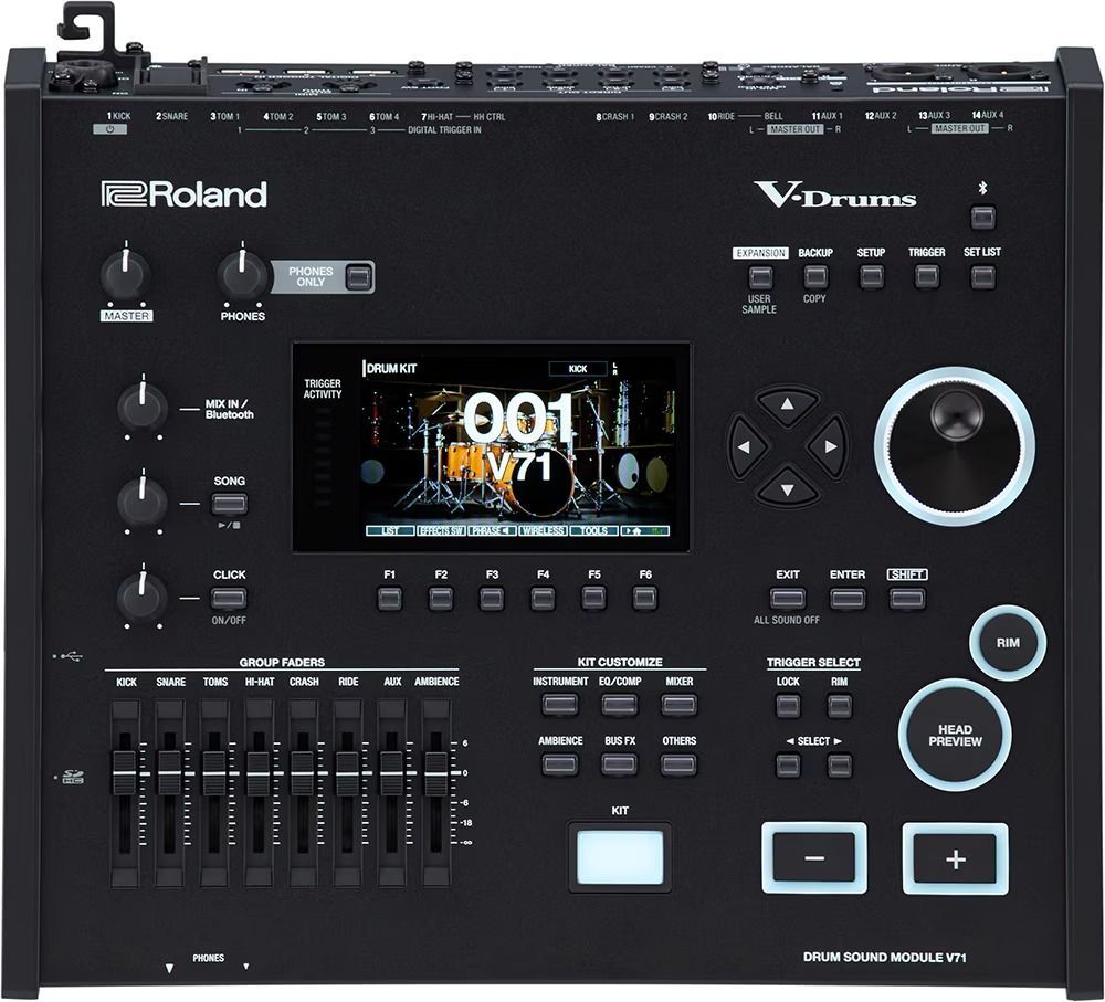『V71』はV の文字を冠して新しく定義されるV-Drums シリーズのフラッグシップ音源モジュールです。Roland Cloud から今後リリースする往年の銘器や、第一線で活躍しているエンジニアが監修したインストゥルメントやキットを本体にダウンロードし、自分だけのキットを構築することが可能。非常に自由度の高いエディット機能やツアーを意識した高い堅牢性、ドラマーをサポートする様々な機能などを搭載しています。