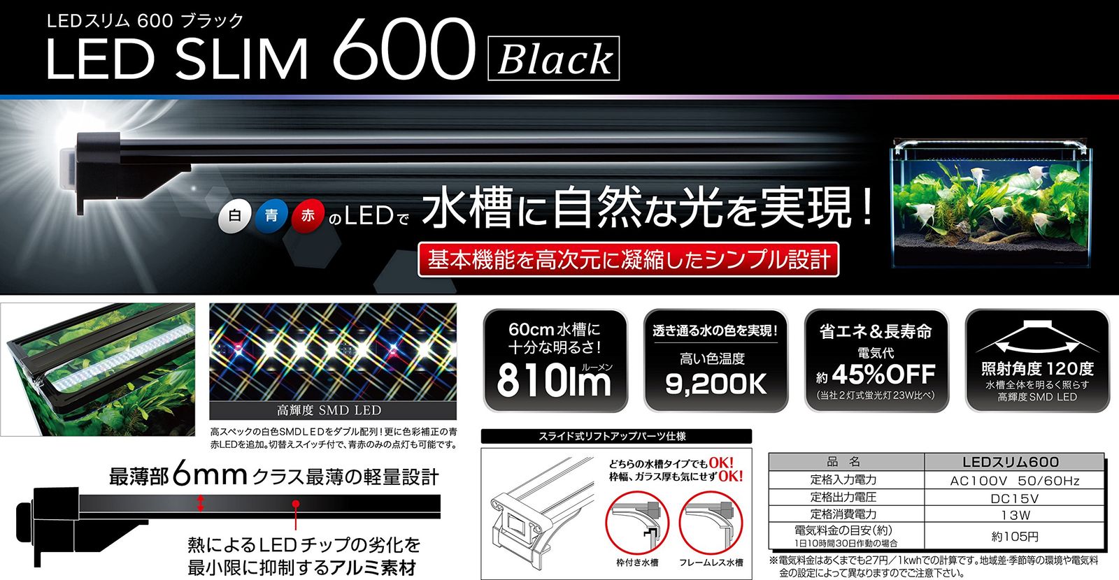 淡水・海水両用セット内容:水槽/高輝度LEDライト/上部フィルター/バックスクリーン/ガラスブタ/水温計/カルキヌキ/保温器具/飼育の手引き。