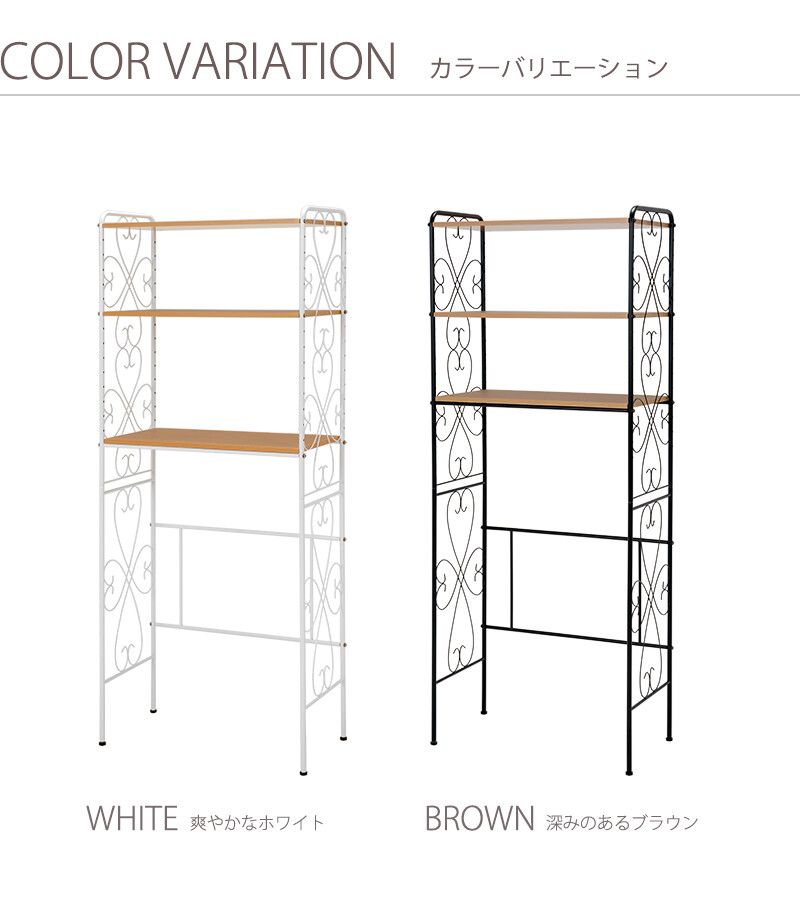 アイアンの曲線がエレガントで、洗濯機の上を有効活用できる洗濯機ラック。