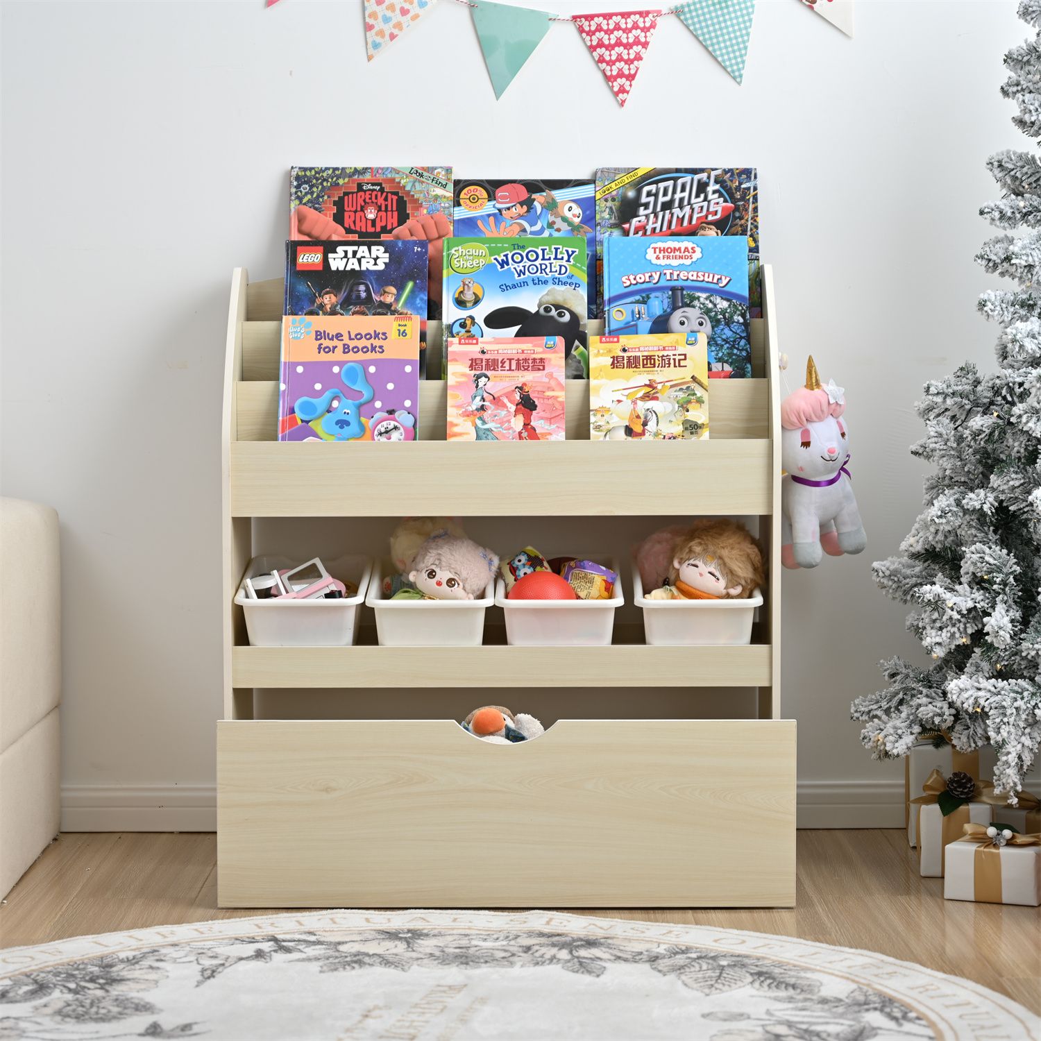 【3段ラック】上段には表紙が見えるあたし3段の絵本立て、お気に入りの本をすっかり収納できます。読みたい絵本がすぐに見つかるから、楽しく選ぶことができます。