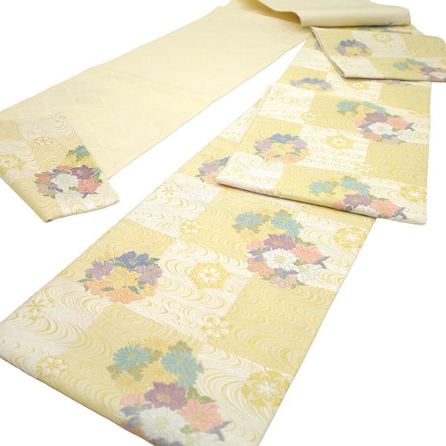 ピンクや紫・水色・白・黄色 などやさしい色合いで、市松に花丸文や流水が美しく唐織にて織り上げられています。