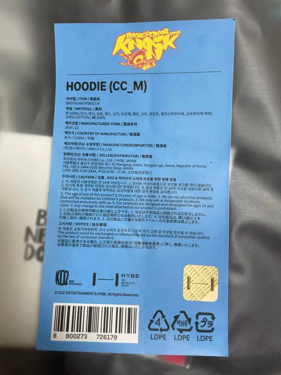 前に購入したのですが、思ったより大きすぎたため、一度着てみて大きすぎたのでまたしまってしまいました!ㅜ 汚れもありませんし、フォトカードも袋だけ一度開け、その後開けたことはありません。念のため服のタグもまた入れておきました。Mサイズです!!購入していただけたら、BOYNEXTDOORのフォトカードやステッカーブックをお付けします..!!!!?????
