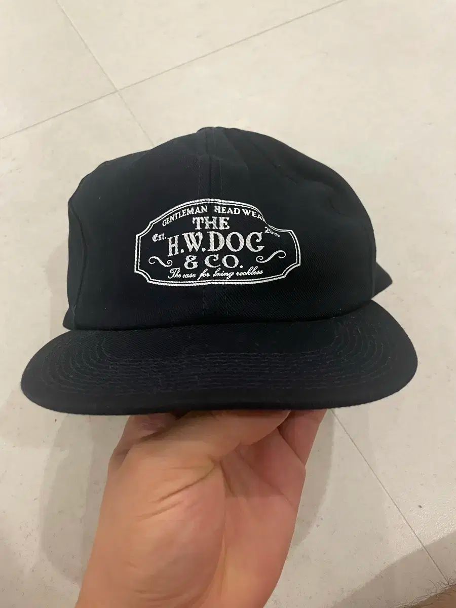 これはH.W.DOG & Coのネイビートラッカーキャップです。黒のボールキャップには白いロゴ刺繍が豪華に施されています。この帽子はカジュアルスタイルに最適です。ご不明な点がなければ、すぐに安心してお支払いいただけます!