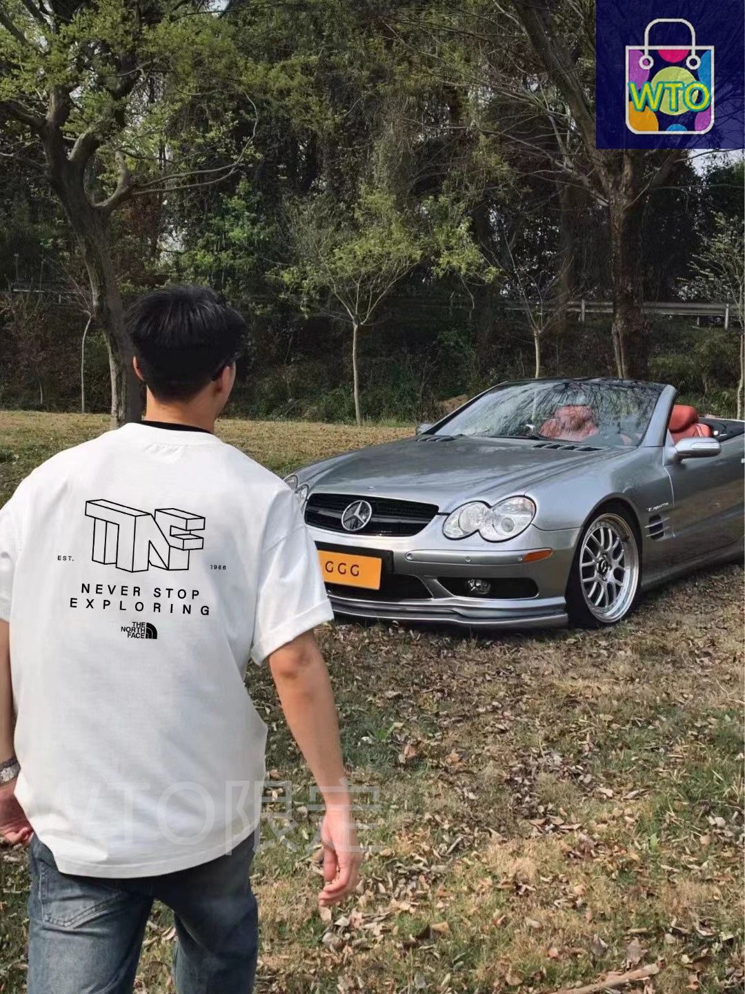 こちらは TNF とのコラボレーションモデルの T シャツです。前後に立体的なブロック文字のロゴがあり、カップルで一緒に着用できる男女兼用のプリント T シャツです。