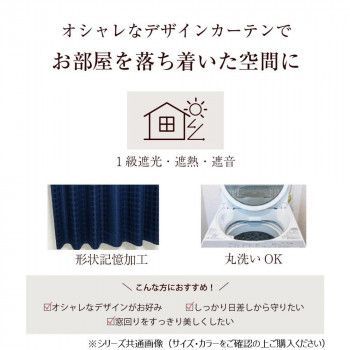 オシャレなデザインカーテンでお部屋を落ち着いた空間に。おうちで丸洗いOKなので、いつでも清潔に保てます。遮光率99.99%以上の1級遮光カーテンです。日差しを最大に防ぐことで、家具やフローリングを日焼けからまもります。プライバシーの確保や快適な睡眠をサポートします。