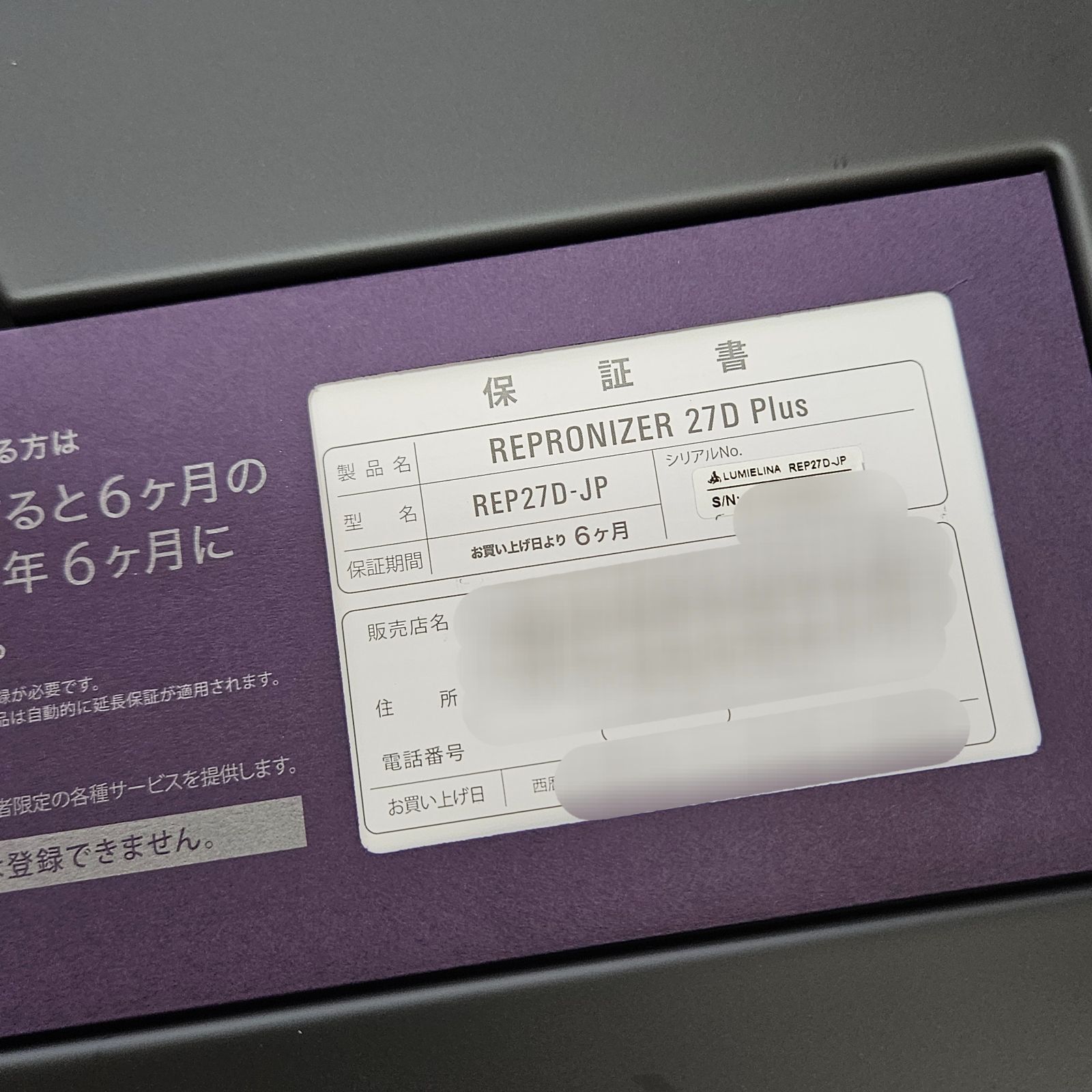 保証書の画像の方は個人情報になりますので一部モザイクをかけております。ご了承ください。レプロナイザーの購入日は2025年9月下旬です。