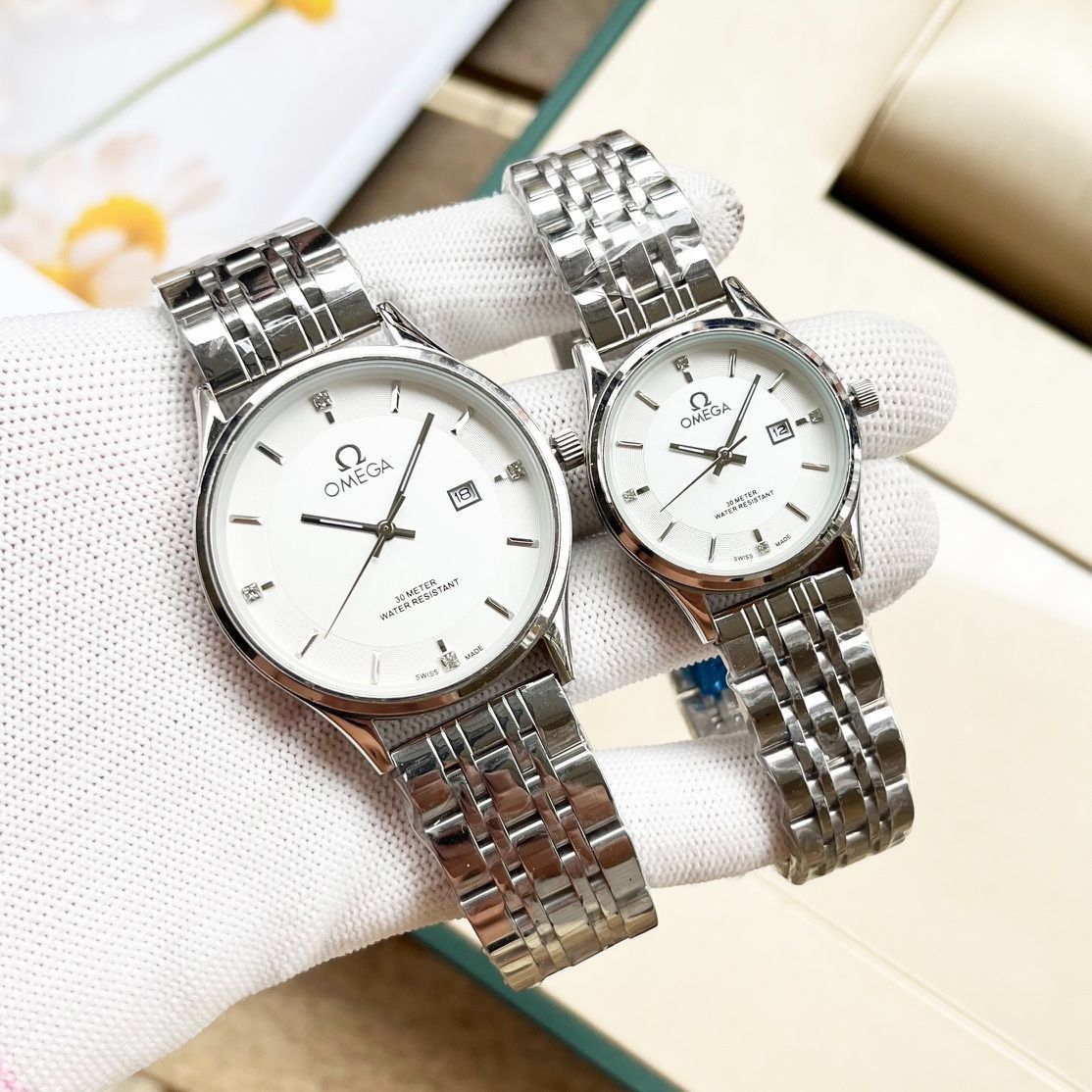 当店では、OMEGA のカップル用腕時計を取り扱っております。この腕時計は、オリジナルの輸入石英ムーブメントを搭載しており、ミネラルガラスの鏡面と 316L ステンレス製のケースを備えています。サイズは男性用が直径 40mm、女性用が直径 30mm で、厚さは 8mm です。