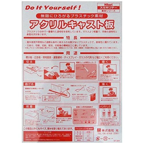 説明 プラスチックの中で一番優れた透明性を保有しています。 ガラスより軽量で、同様の陽明生徒表面光沢があります。 屋外使用や証明など過酷な条件に耐えられる数少ないプラスチックで、耐候性に優れています。 穴あけ、切断、切削、彫刻、印刷等の機械加工に適しています。ただし、アルコール系の薬品に侵されにくい反面、接着加工については、溶剤(接着液)の浸透が押し出し板より遅いのでご注意ください。 用途:標示板・広告板・照明器具・建築資材・ディスプレイ・ガラスの代用など幅広くご使用ください。