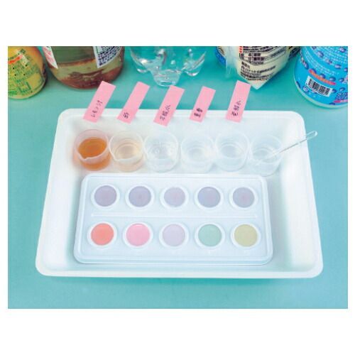 ムラサキキャベツ液とリトマス試験紙による酸性・中性・アルカリ性を調べるキットです。