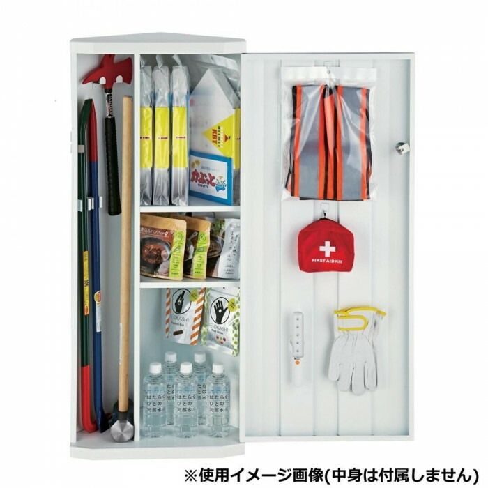 オフィスからの脱出や救助活動のための初期対応用具や災害直後に必要な用具を収納します。コーナーのデットスペースに設置可能な災害救助用具収納ボックスです。
