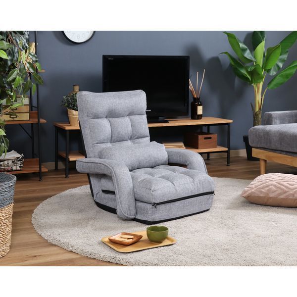 高い強度、耐久性を誇るKOYO製のギアを使用。背もたれをお好みの角度に調整できます。ボリューム感のある肉厚クッションで立ち座りもしやすい!クッション付きで腰当てや枕としてお使いいただけます。座面を広げればゆったり足を伸ばしてリラックスできます。座面は本体から取り外しできるので、分離して座布団のように使うことができます。ひじ掛けは背もたれに連動するのでフラット状態にでき、お昼寝にも最適です。来客時などで邪魔になったときは、折りたたんで隙間に収納!