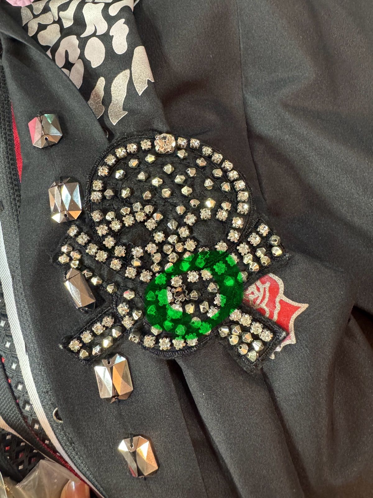 後ろのドクロと、胸元のドクロのストーンがひとつとれています。
