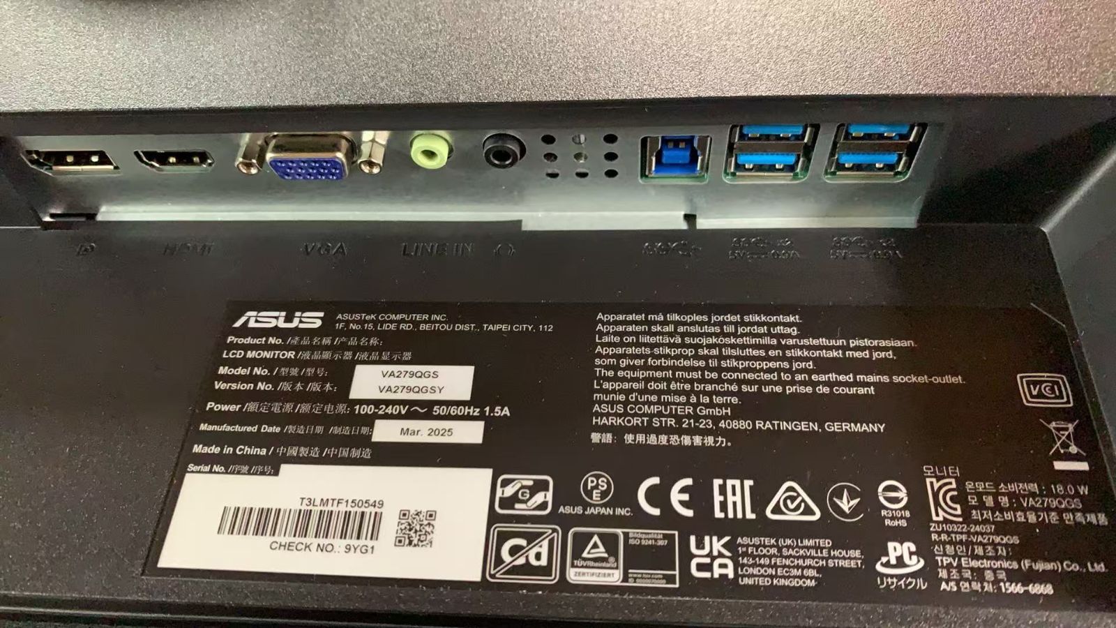 入力端子:DisplayPort 1.2 × 1、HDMI(v1.4)× 1、VGA ×1、USB 3.2 Gen 1 Type-A ×4、3.5mmステレオミニジャック