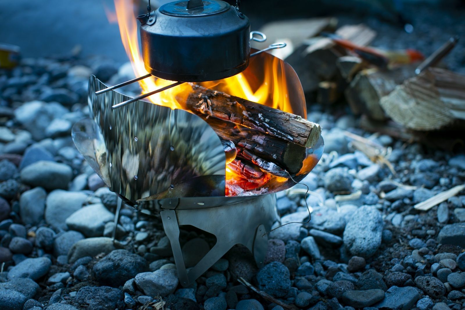 コンパクトなのに市販の薪をそのまま置くことが可能、付属の風防と火箸を利用する事で