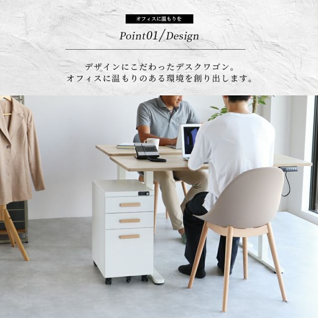 説明引出しロック付きの小ぶりなデスクワゴン。机の下や横に置いてもゆとりを持って使用可能。