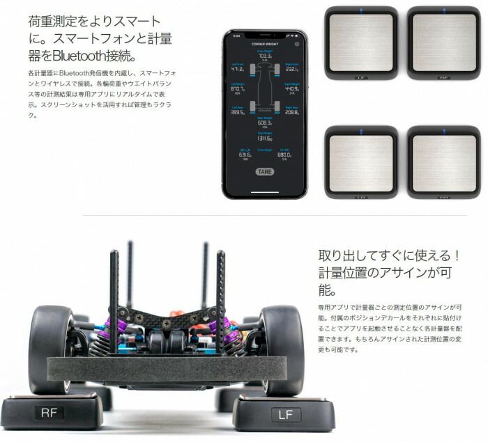 スマートフォンと計量器をBluetooth接続。各計量器にBluetooth発信機を内蔵し、スマートフォンとワイヤレスで接続。各輪荷重やウエイトバランス等の計測結果は専用アプリにリアルタイムで表示。スクリーンショットを活用すれば管理もラクラク。