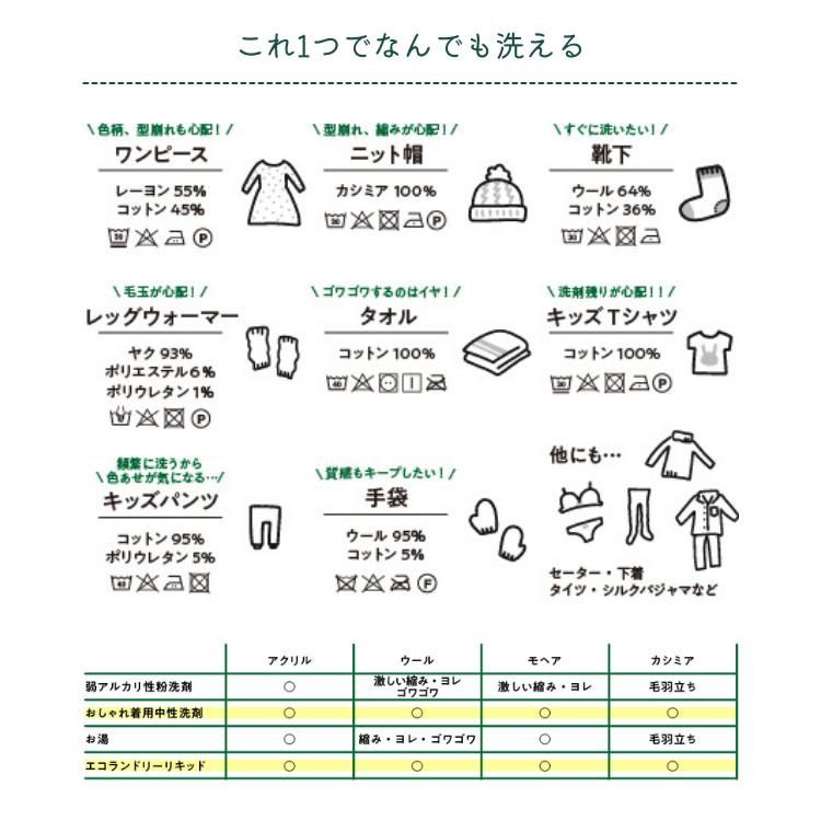 柔軟剤不要でドライマーク品やおしゃれ着、レインウェアなど1本でいろいろなものを洗えます!