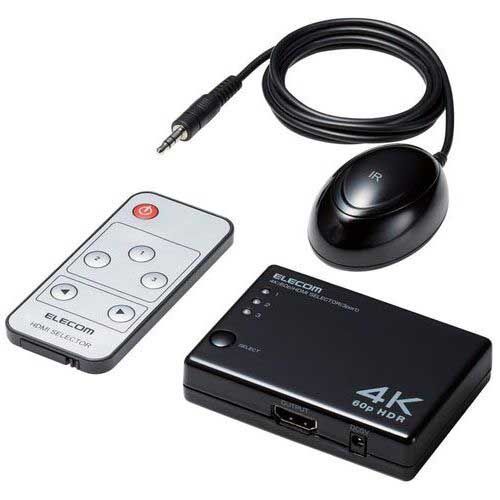 4KモデルのHDMIポート不足を解消できる3ポートHDMI切替器。●対応機種:HDMI出力端子を搭載したテレビ・ディスプレイ・プロジェクター、AV機器、家庭用ゲーム機、メディアストリーミング端末、パソコンなど●コネクタ形状:入力=HDMIメス×3、出力=HDMIメス×1、電源=DCジャック(メス)/主な対応解像度:4K(4096×2160)30Hz/60Hz、4K(3840×2160)30Hz/60Hz、2K(1920×1080)60Hz、1080i/720p/576p/576i/480p/480i●HDMI規格:HDMI2.0b●HDR:HDR10、DolbyVision(R)、HLG対応●受光ユニットケーブル長:1.2m●許容ケーブル長:入出力側共に5m以内(4KHDRや4K60Hzなどでの使用の場合はPremiumHDMIケーブルをご使用ください)
