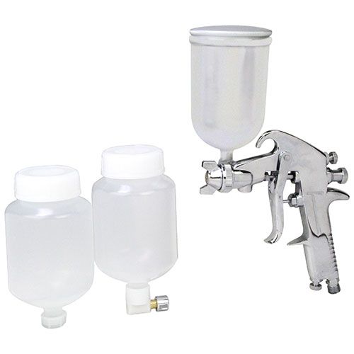 【仕様】 ●塗料供給方式:重力式。 ●塗料ノズル口径:1.3mm。 ●空気圧仕様:通常圧:0.3MPa・最高圧:0.69MPa。 ●空気使用量:90L/min。 ●容器仕様・アルミ:400cc・プラ:450cc。