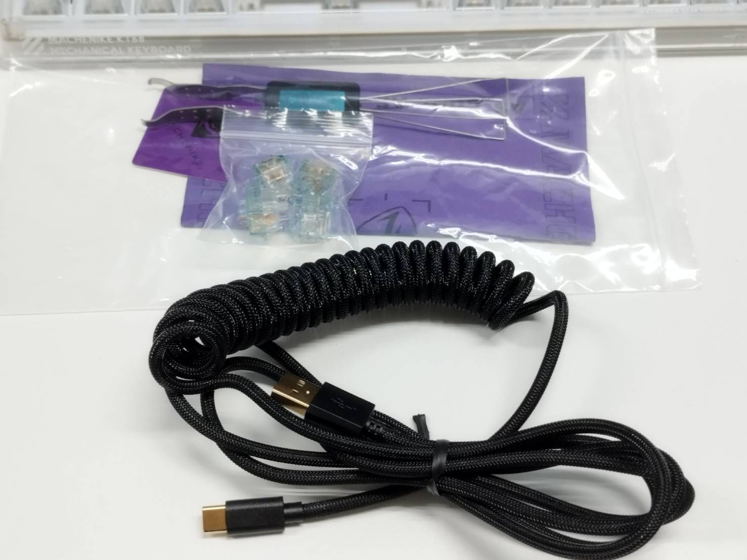 キーボード、Type-Cケーブル、キーキャッププラー、交換用キーキャップ×4、印刷物(画像1枚目に写っているもの)
