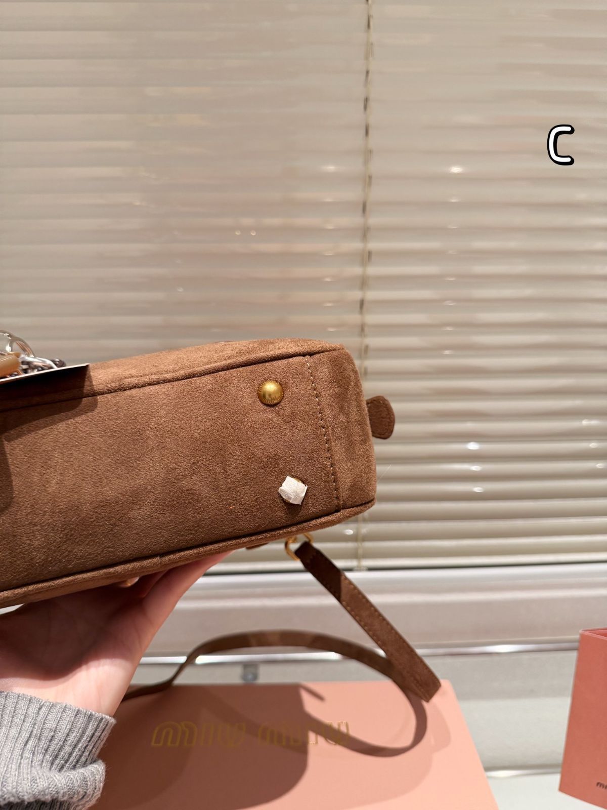 MIU MIU限定モデルのスエードカメラバッグ。シンプルで使いやすいデザインが特徴です。