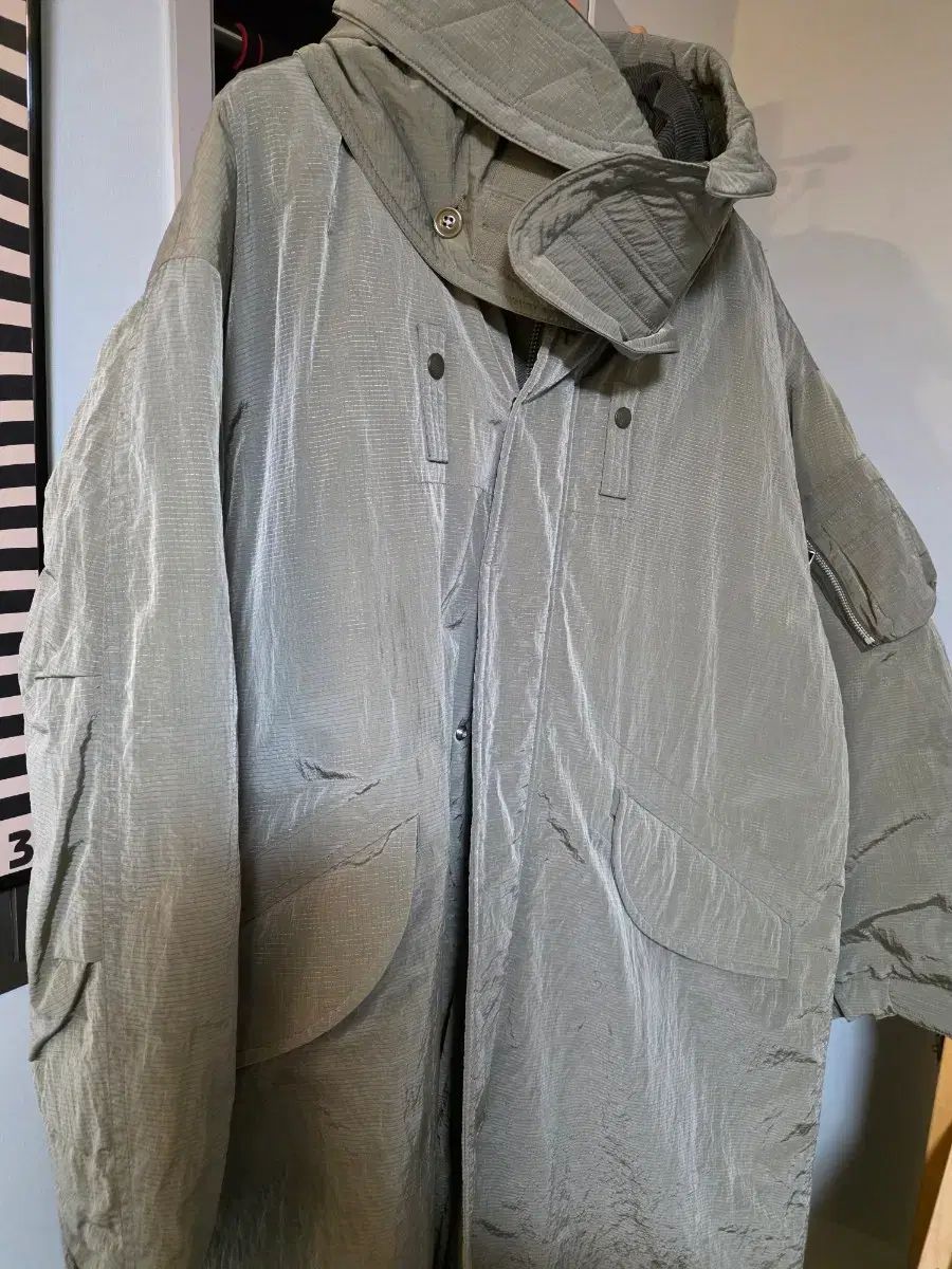 中にパラシュートのようにストラップも付いており、光沢のある素材が本当に高級感があります。ライナーにQデュロイ処理されたフードも付いており、取り外しも可能です。ダウンパディングと本当に暖かいです。