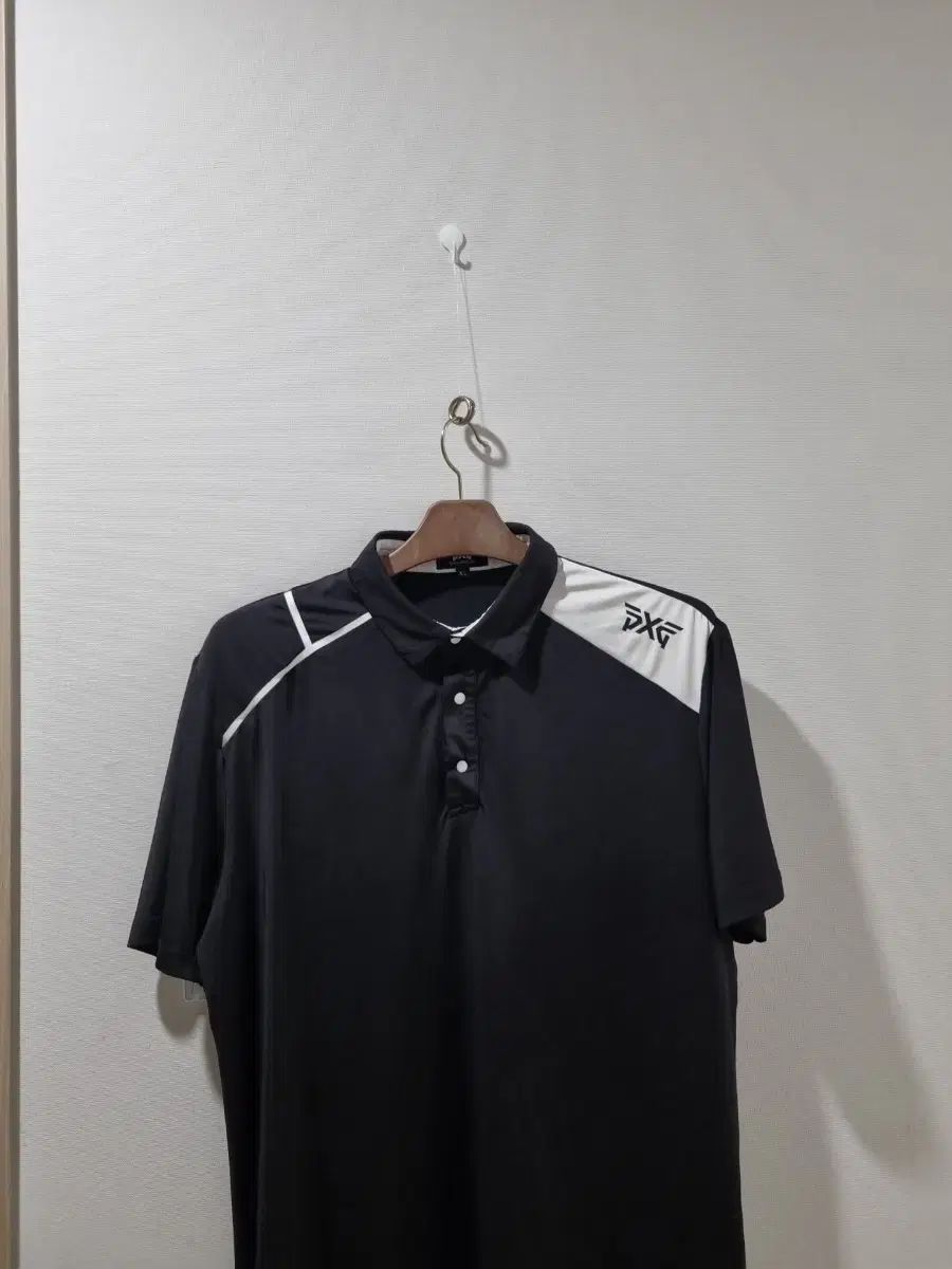 PXG ブラック/ホワイト バイカラー 半袖 カラーTシャツです。ショルダー部分に白色でPXG ロゴがPOINTで入っています。