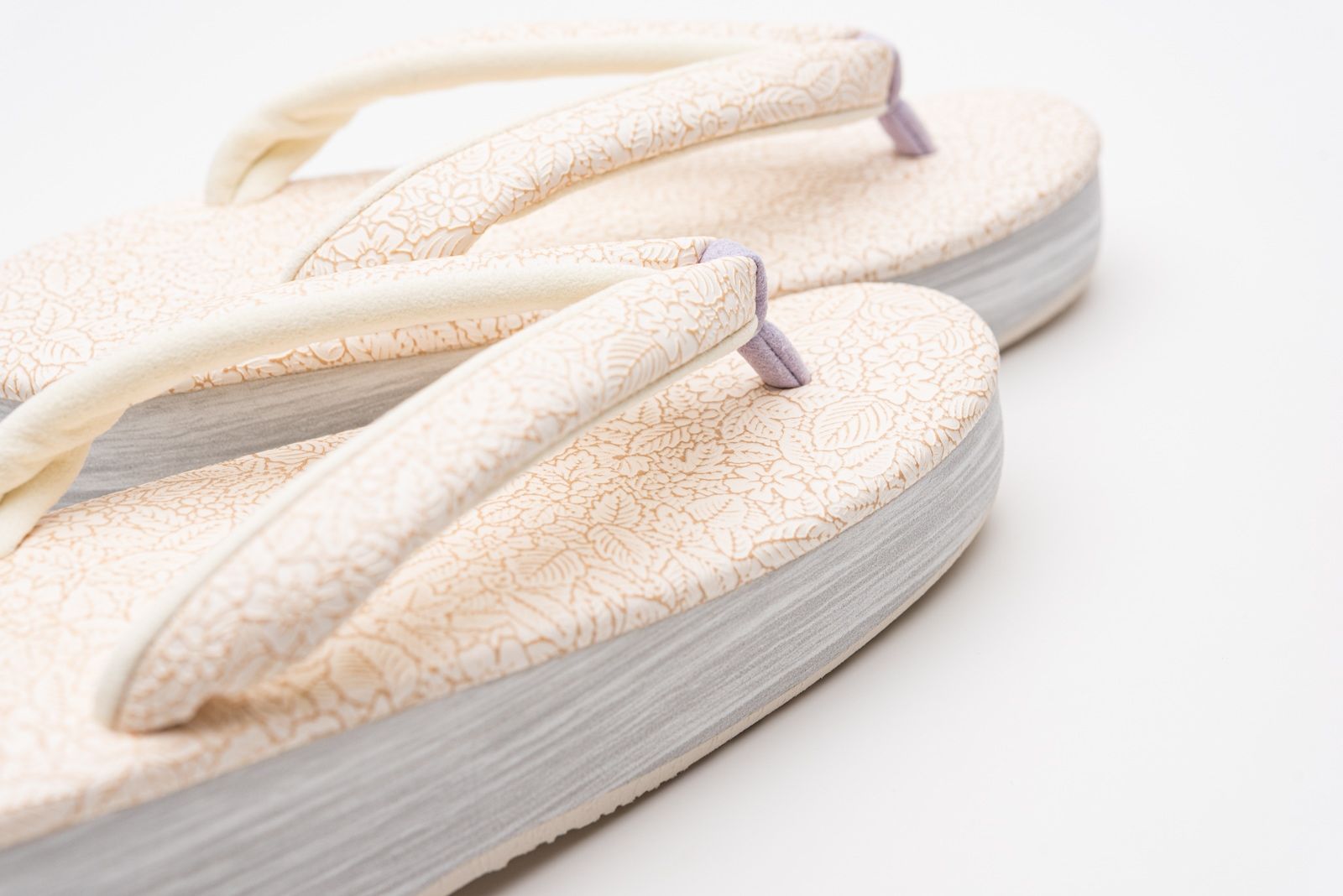 小さな花や葉っぱの柄を緻密に配したカフェ草履です。