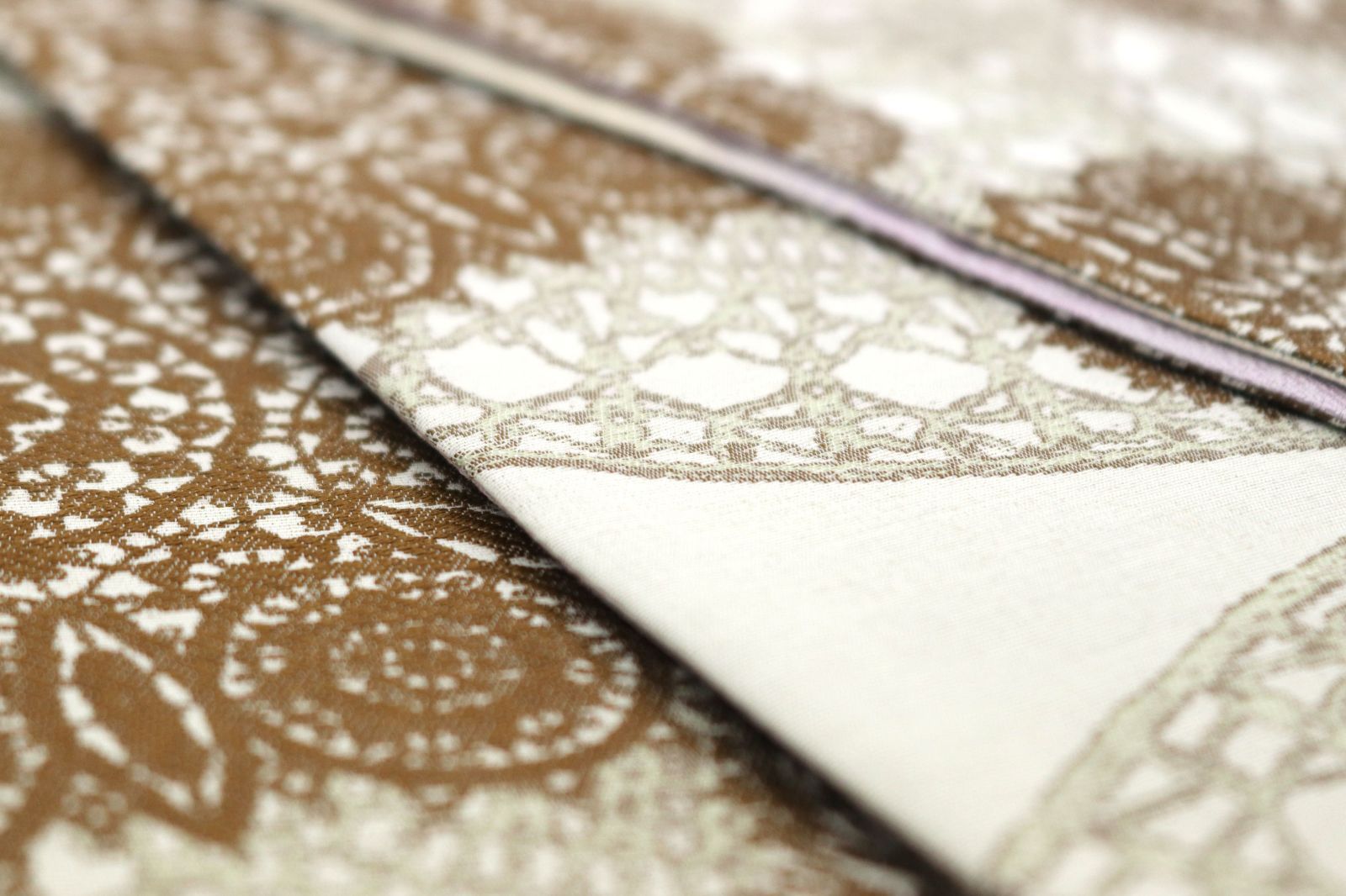 全体には、焦げ茶色のお色目でレース模様が織り上げられておりま。