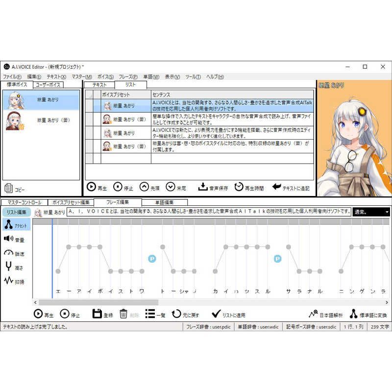 「A.I.VOICE 紲星あかり」は、明るく可愛らしい女の子の声をベースに、簡単に表現力豊かな音声が作成できるソフトです。