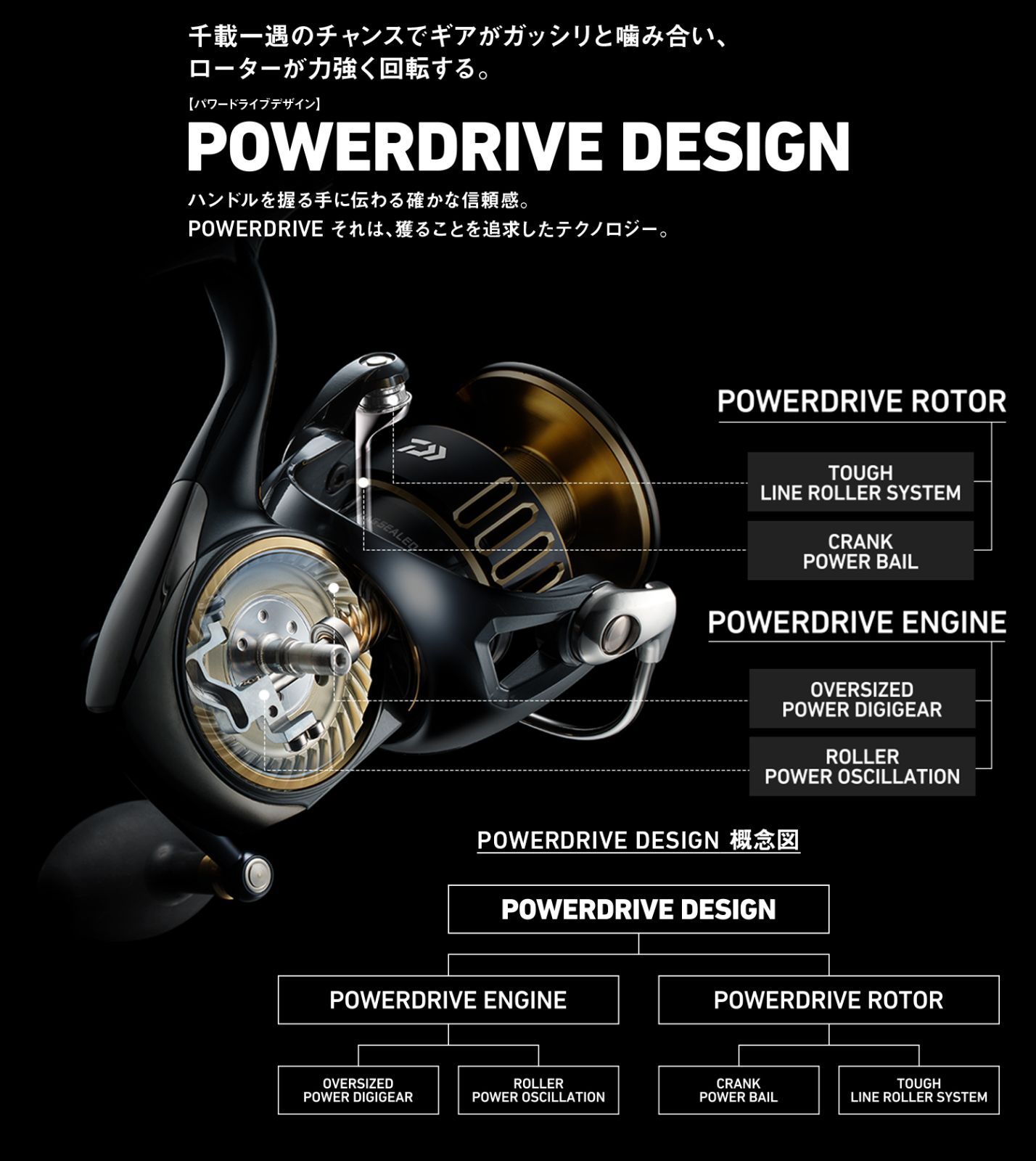 その[パワードライブエンジン]を土台に、フロントユニットを構成するのが 金属素材(AL)の[パワードライブローター]。合理的な球体形状で、低イナーシャを維持したまま、さらなる剛性のアップを実現。このローターに搭載される [クランクパワーベール]と[タフラインローラーシステム]との相乗効果により、的確なラインの送り出しと、スムーズな巻き取り動作への移行が可能となった。