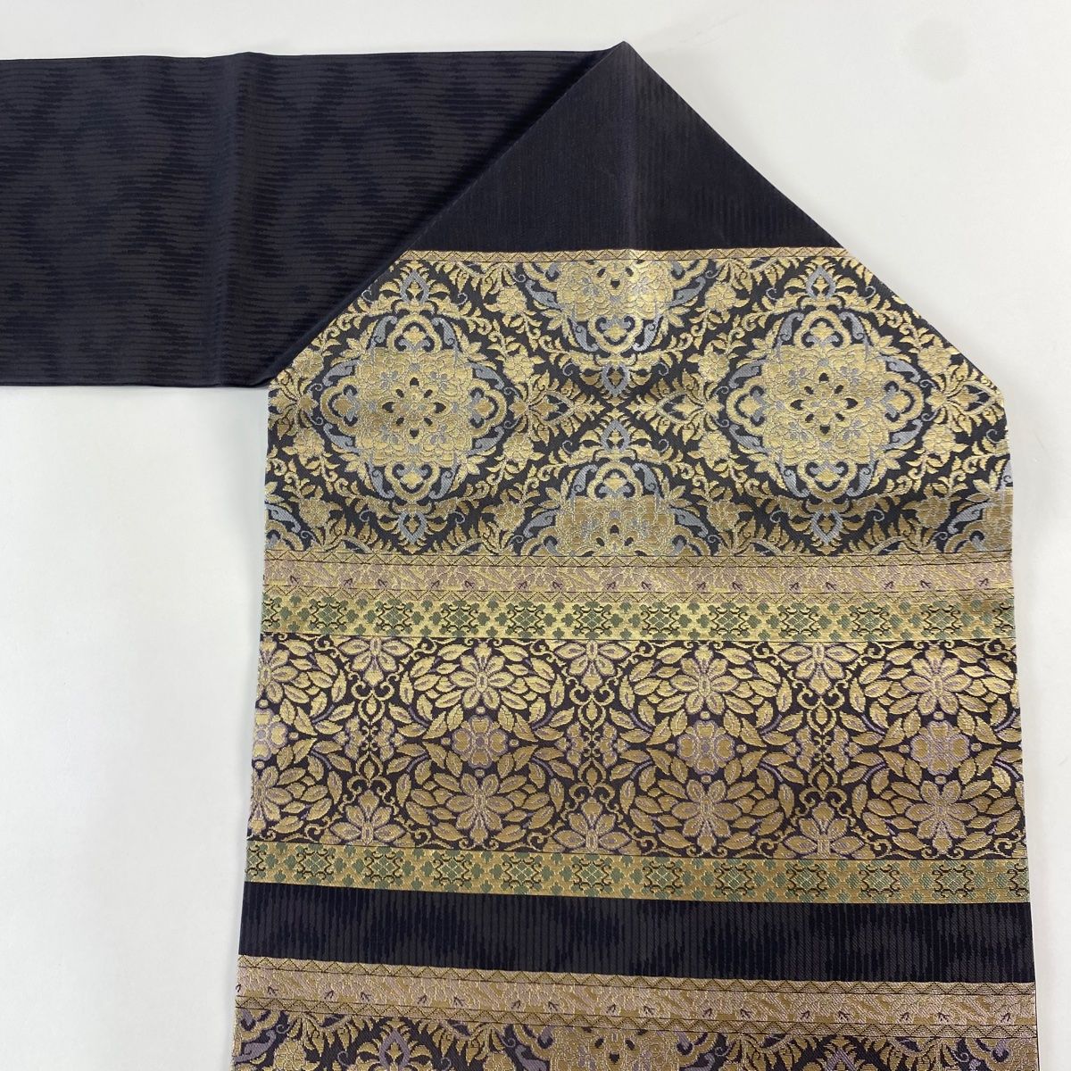 名古屋帯 秀品 華文 花唐草 箔 黒灰 正絹