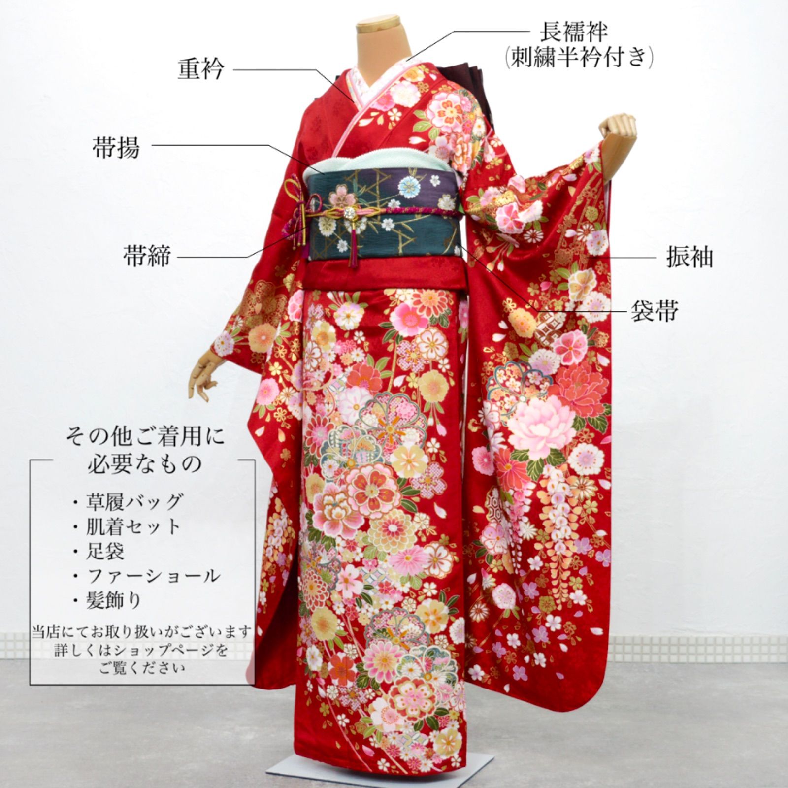 また、お振袖フルセットの他にも、ファーショールや髪飾り、草履バッグ、肌着関連など、創業100年の呉服屋にて長年経験を培ってきた目利きで選び抜かれたお着物関連商品も多数お取り扱いいたしております。