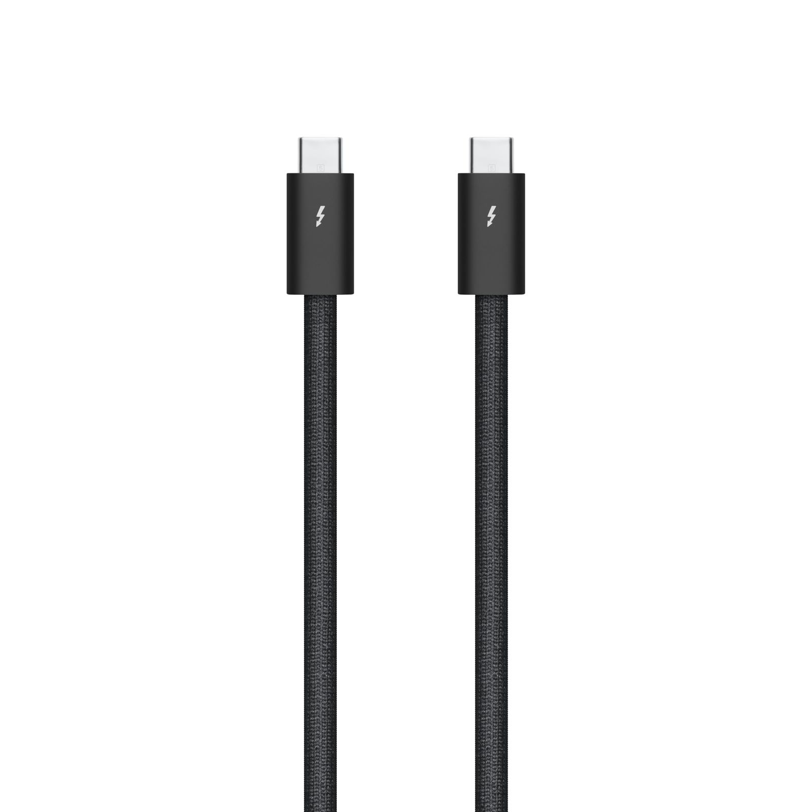 絡まずに巻くことができる、1メートルのブラック編組ケーブル。Thunderbolt 5による最大120Gb/sのデータ転送、Thunderbolt 3、Thunderbolt 4、USB 4による最大40Gb/sのデータ転送、USB 3による最大10Gb/sのデータ転送、DisplayPort 2.1ビデオ出力、最大240Wの充電に対応します。